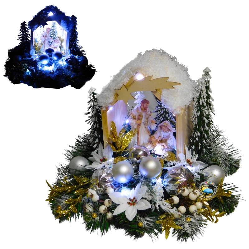 DUŻA DREWNIANA SZOPKA BOŻONARODZENIOWA PODŚWIETLANA - OŚNIEŻONA SCENERIA ŚWIATECZNA ZE ŚWIĘTĄ RODZINĄ