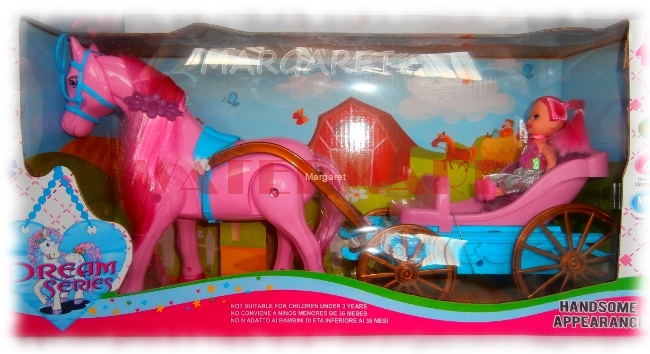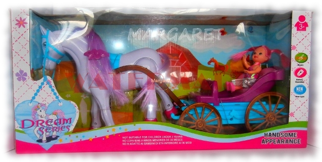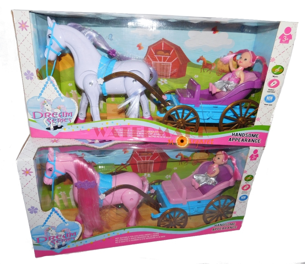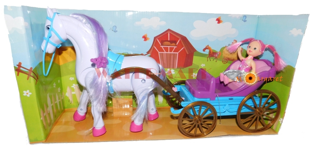 Koń zasilany bateriami, chodzi i ciągnie bryczkę w rytmie wesołej melodii. Koń jest funkcyjny, wydaje dźwięki, kręci głową. Ma długą grzywę do czesania i stylizacji. Do zestawu dołączona jest lalka księżniczka. Cały zestaw wykonany jest z bardzo dobrego gatunkowo tworzywa sztucznego.