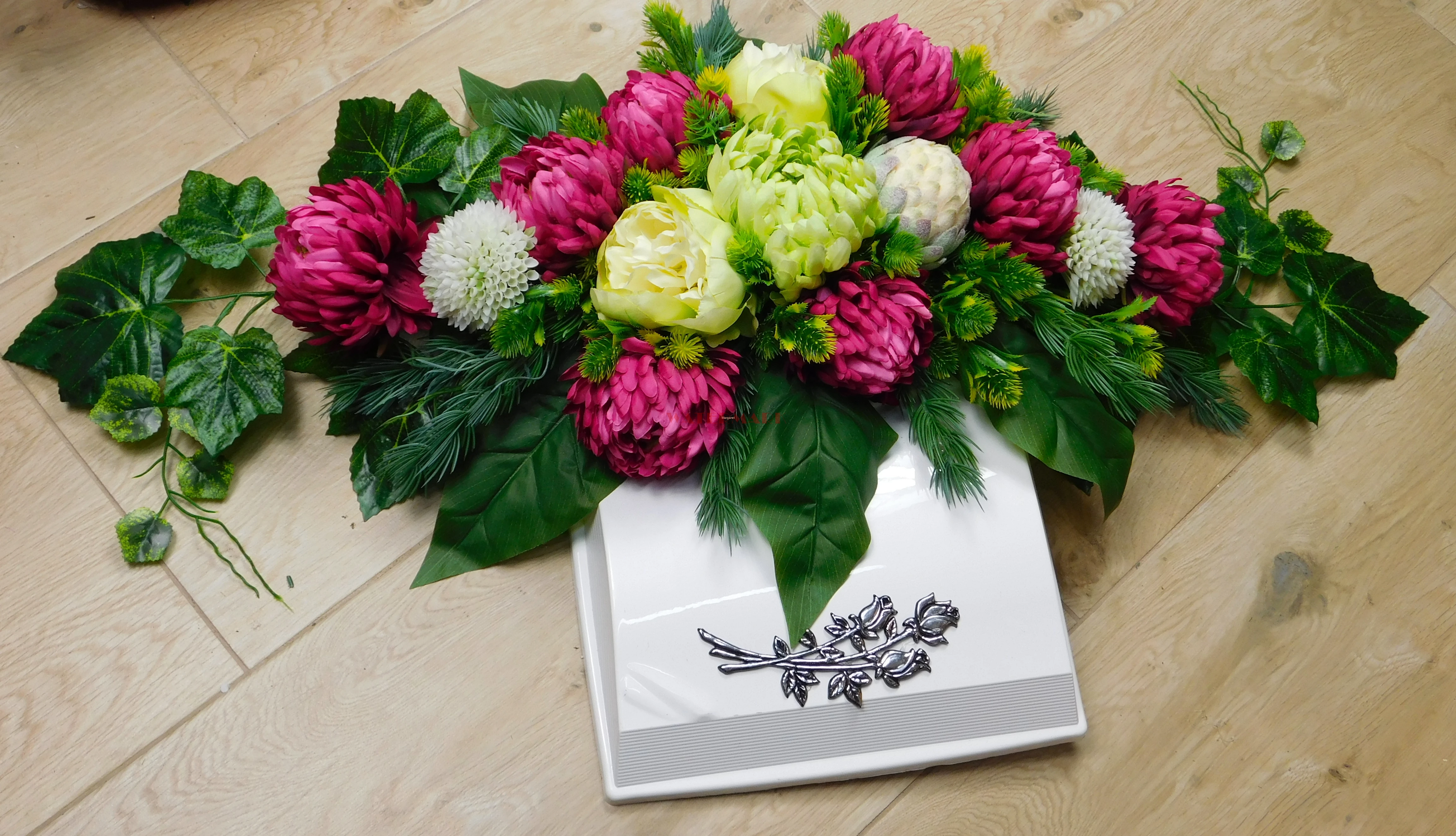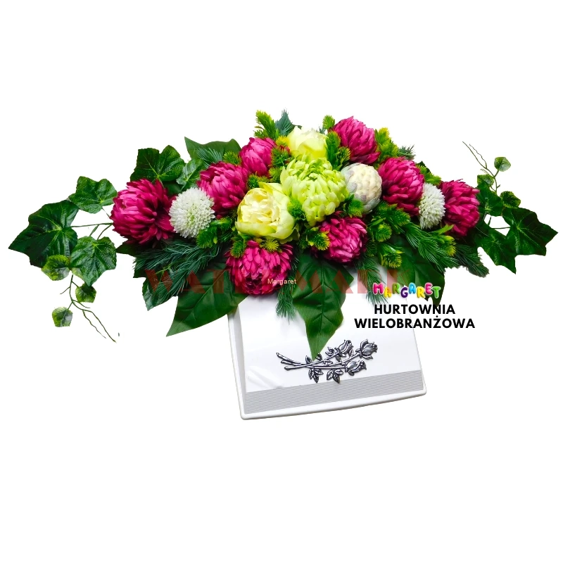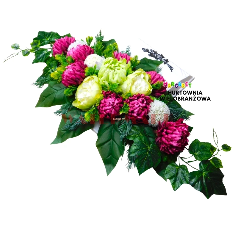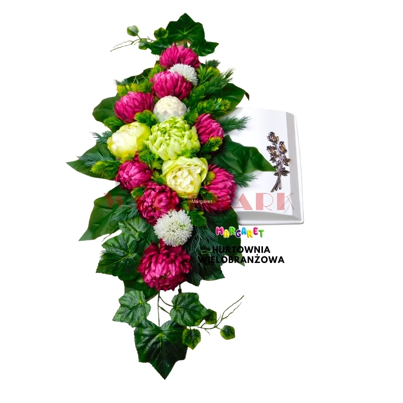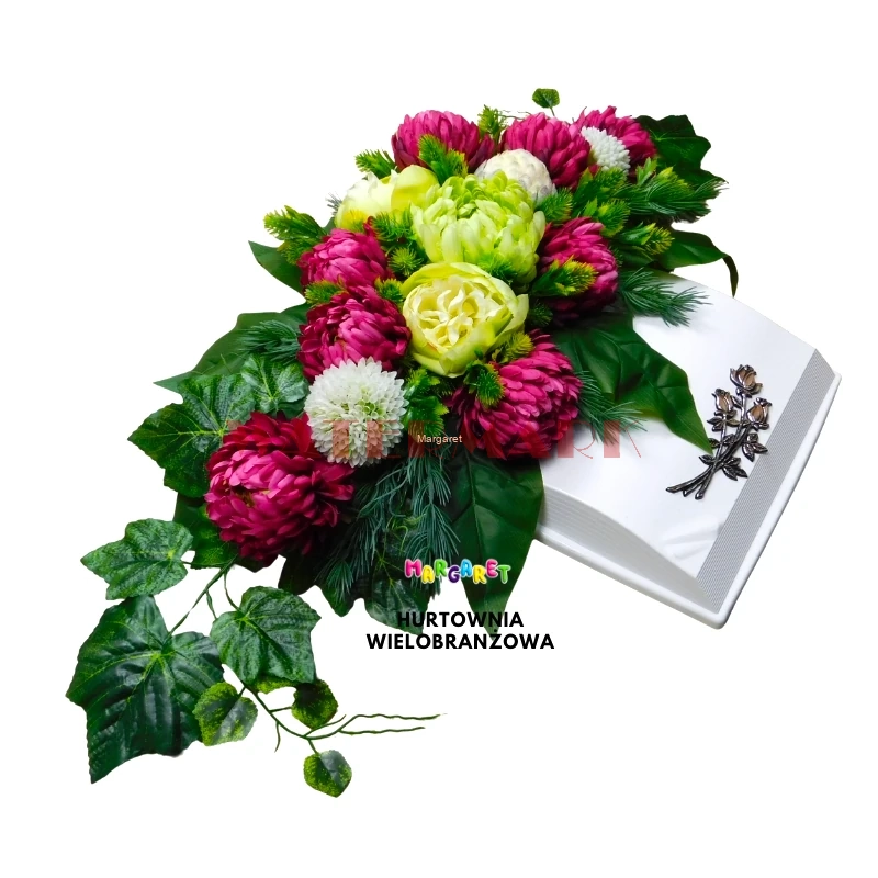 KOMPOZYCJA NAGROBNA BIAŁA KSIĄŻKA Z RÓŻOWYMI CHRYZANTEMAMI I LOTOSEM 100CM