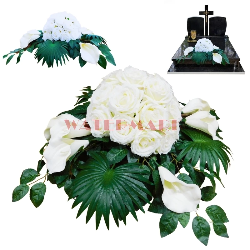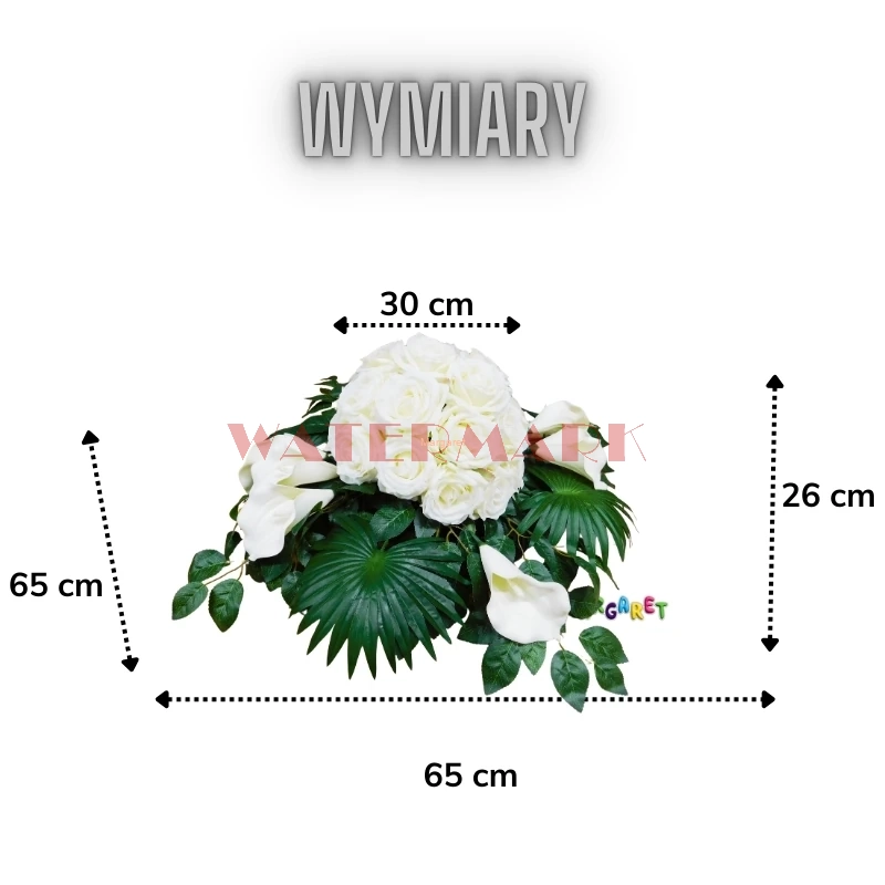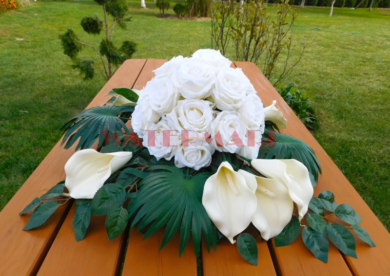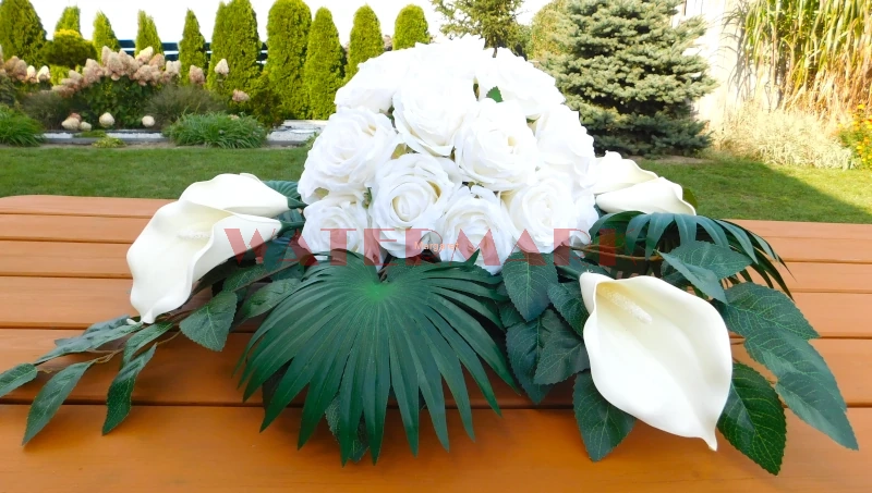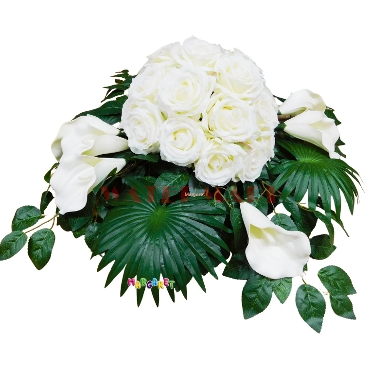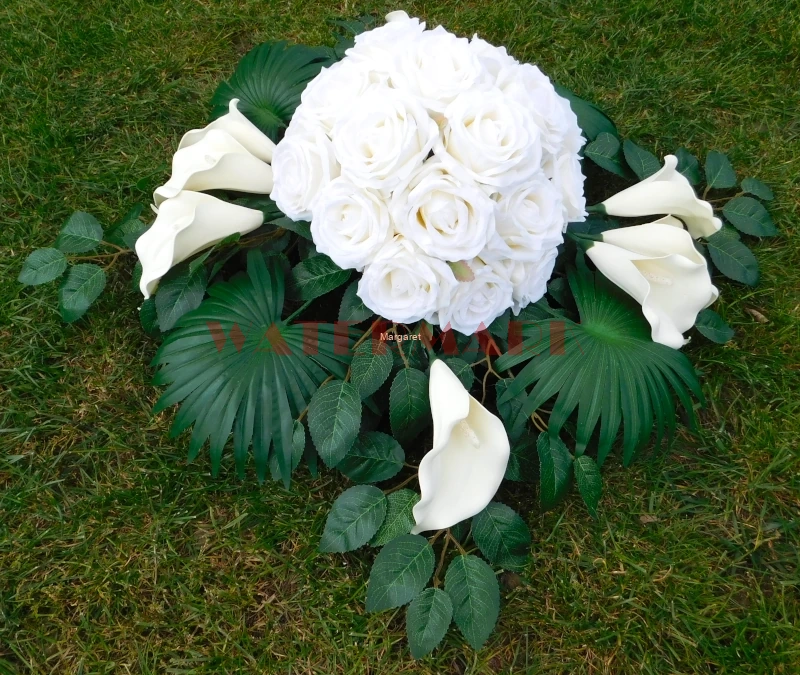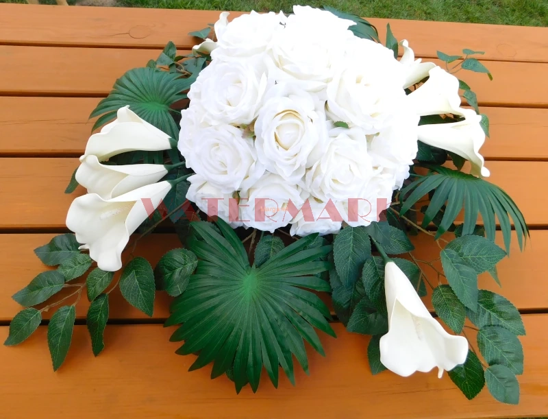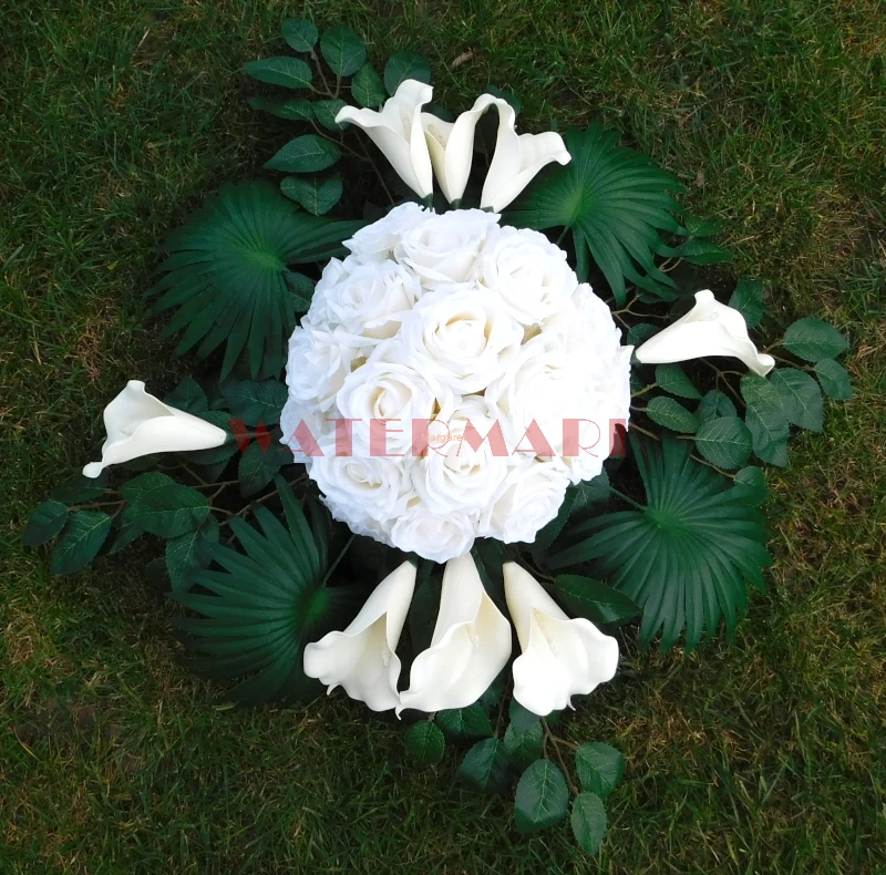 KOMPOZYCJA W FORMIE KULI Z KREMOWYCH RÓZ I KALII Z LIŚĆMI PALMOWYMI