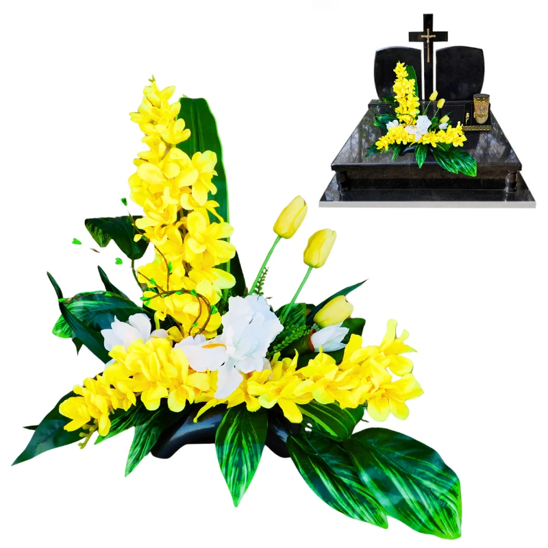 KOMPOZYCJA NAGROBNA Z POMARAŃCZOWYCH RÓŻ Z DODATKAMI DŁUGOŚĆ 75 CM
