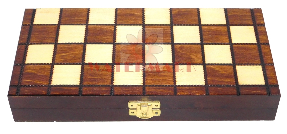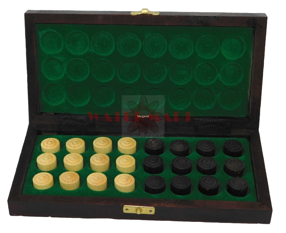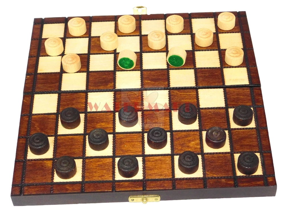 Ciemne figury i warcaby zostały pokryte ciemną bejcą w kolorze brązowym.