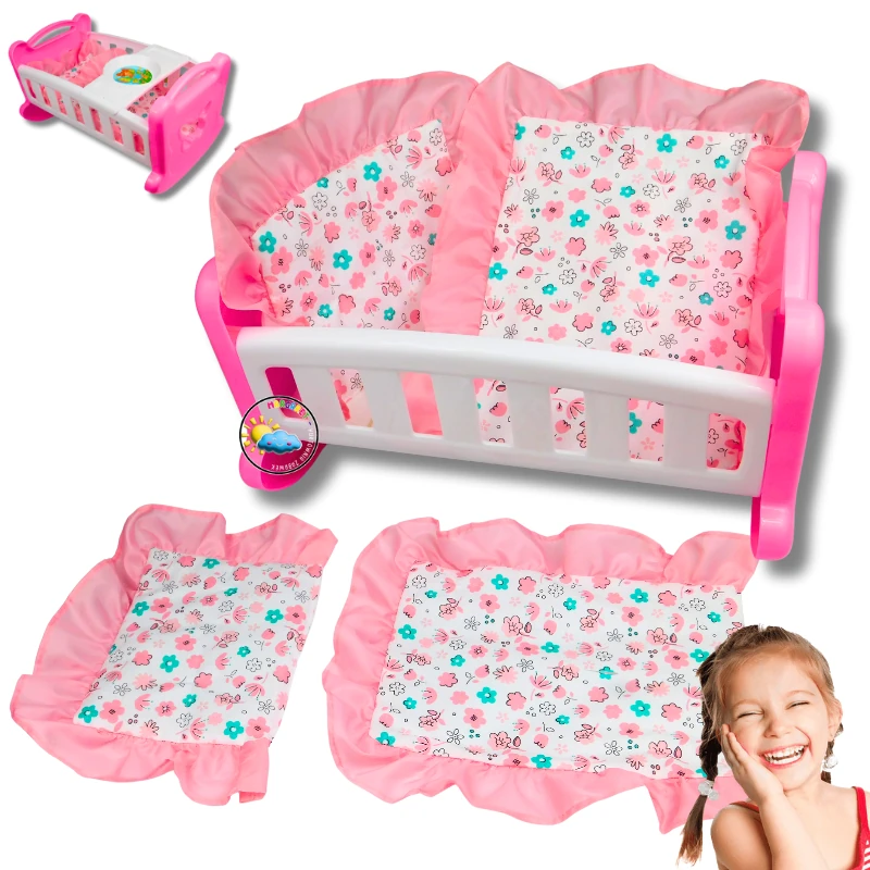 DREWNIANA KOŁYSKA DLA LALEK Z POŚCIELĄ  3 CZĘŚCIOWĄ I LALKĄ ŚPIEWAJĄCĄ