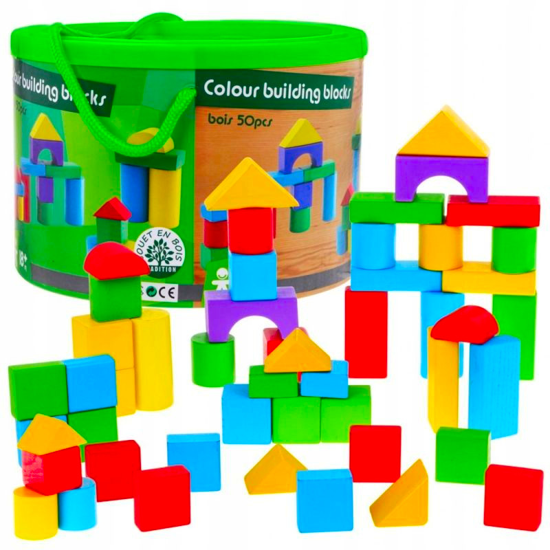 DREWNIANE KOLOROWE KLOCKI 50 SZT Z WIADERKIEM SORTEREM