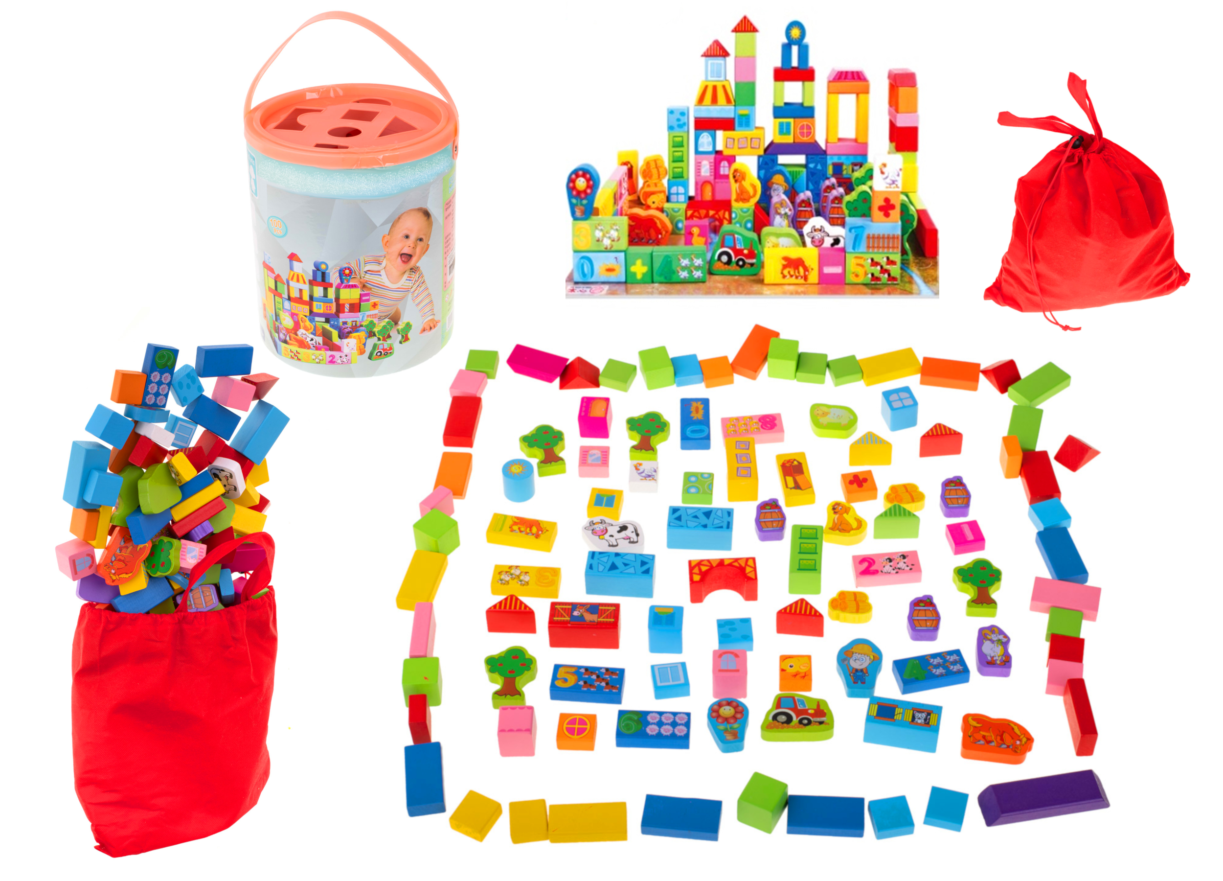 DREWNIANE KOLOROWE KLOCKI 100 SZT Z WIADERKIEM SORTEREM